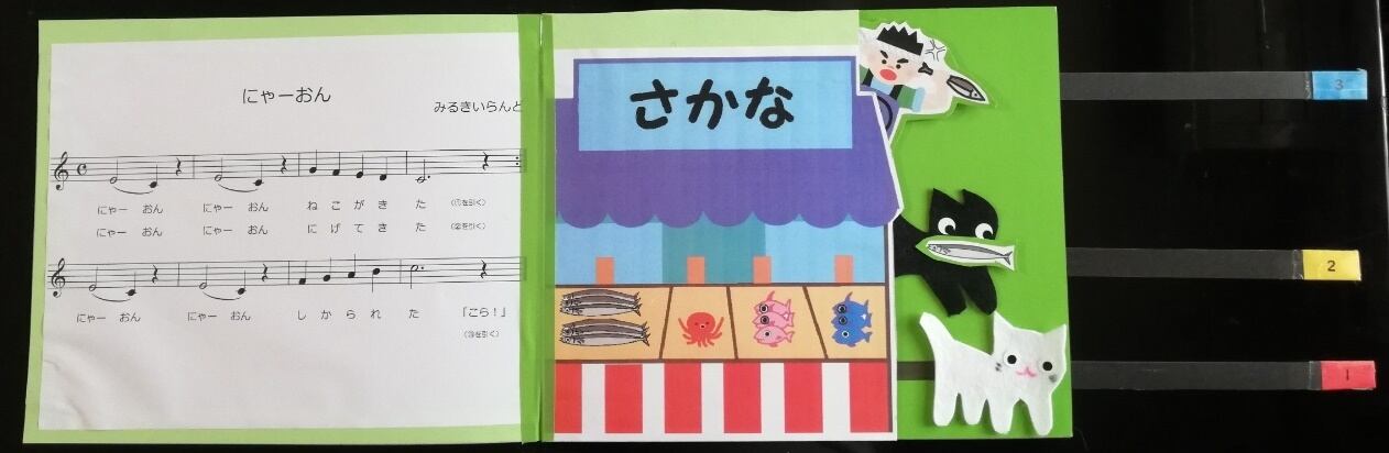 「にゃーおん」は教室で一番人気といえる仕掛け絵本楽譜です。